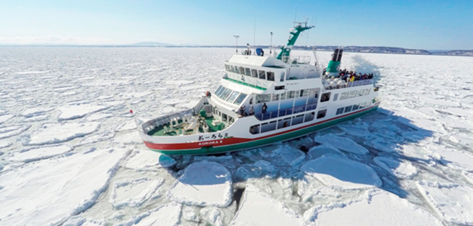 | 겨울이 시작되면 시베리아의 아무르강에서 형성된 유빙이 바람과 조류를 타고 서서히 남쪽으로 흘러 내려와 아바시리에서 이 유빙을 만날 수 있습니다. "오로라"라고 불리는 유빙선은 유빙에 뒤덮힌 바다의 얼음을 부수면서 나아갑니다. 매년 1월 하순에서 3월 하순까지만 볼 수 있는 이색관광지로 운이 좋으면 유빙의 천사 "클리오네(껍데기를 가지지 않은 조개류)"와 바다표범 등 야생 동물들을 만날 수 있습니다. |