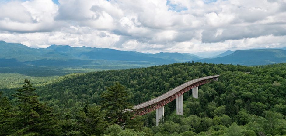 | 카미카와와 토카치를 연결하는 경계에 위치하며 도로의 표고는 약 1,139미터. 홋카이도에서 가장 높은 차로 다닐 수 있는 도로입니다. 눈 아래에 거대한 삼림의 파노라마가 펼쳐지며 멀리는 산들의 능선을 바라볼 수 있는 절경입니다. 단풍철에는 특히 훌륭하고 멋진 풍경으로 둘러싸여집니다. 거대한 삼림이 보이는 대교를 바라볼 수 있는 전망대가 있고, 전망대에서 직접 추출한 커피를 맛볼 수 있는 카페(4월 중순~11월 초순 영업)가 있습니다. |